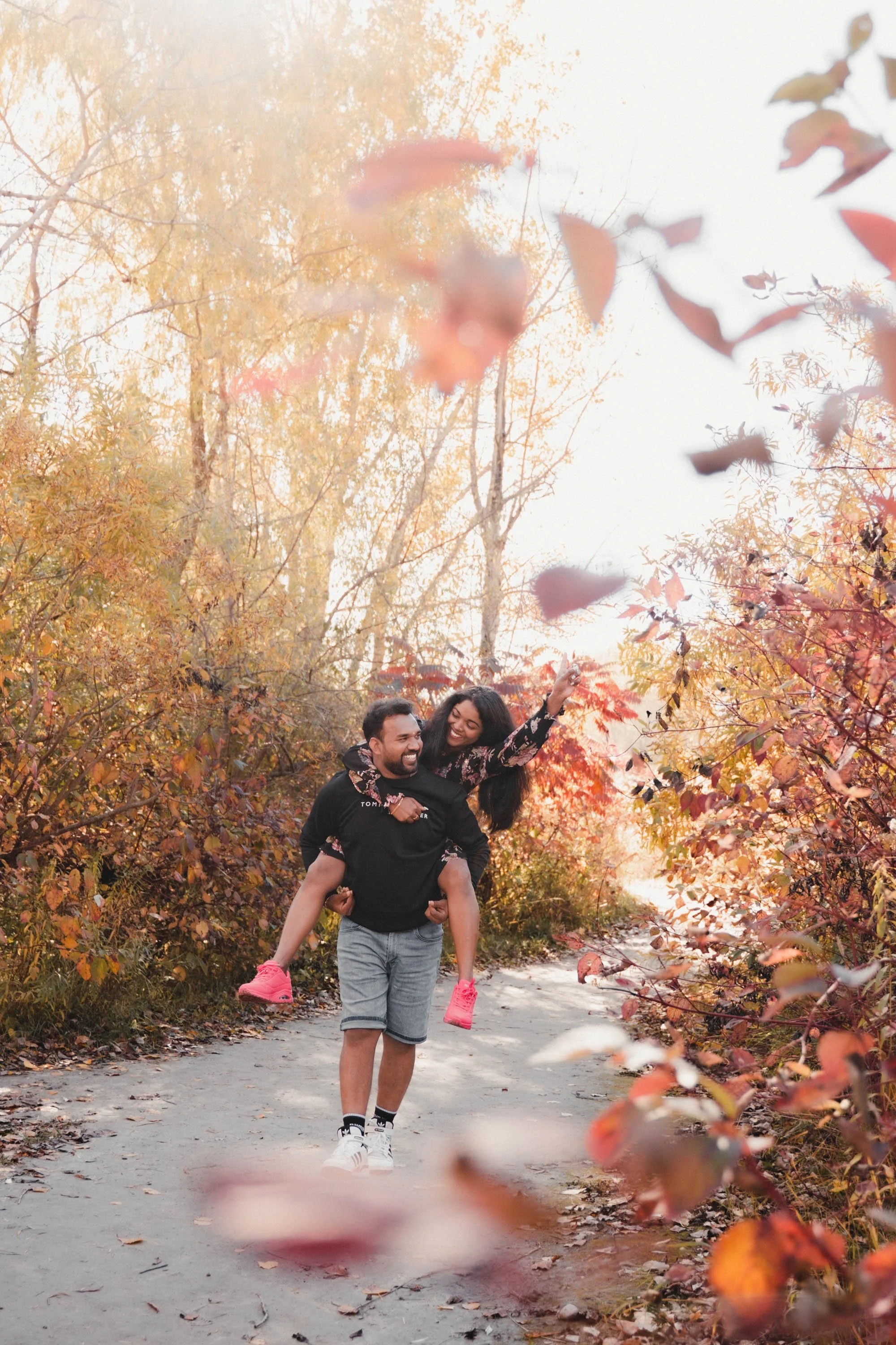 A black-and-white photo of a couple embracing outdoors, with the man kissing the woman's forehead, both smiling and with their eyes closed.