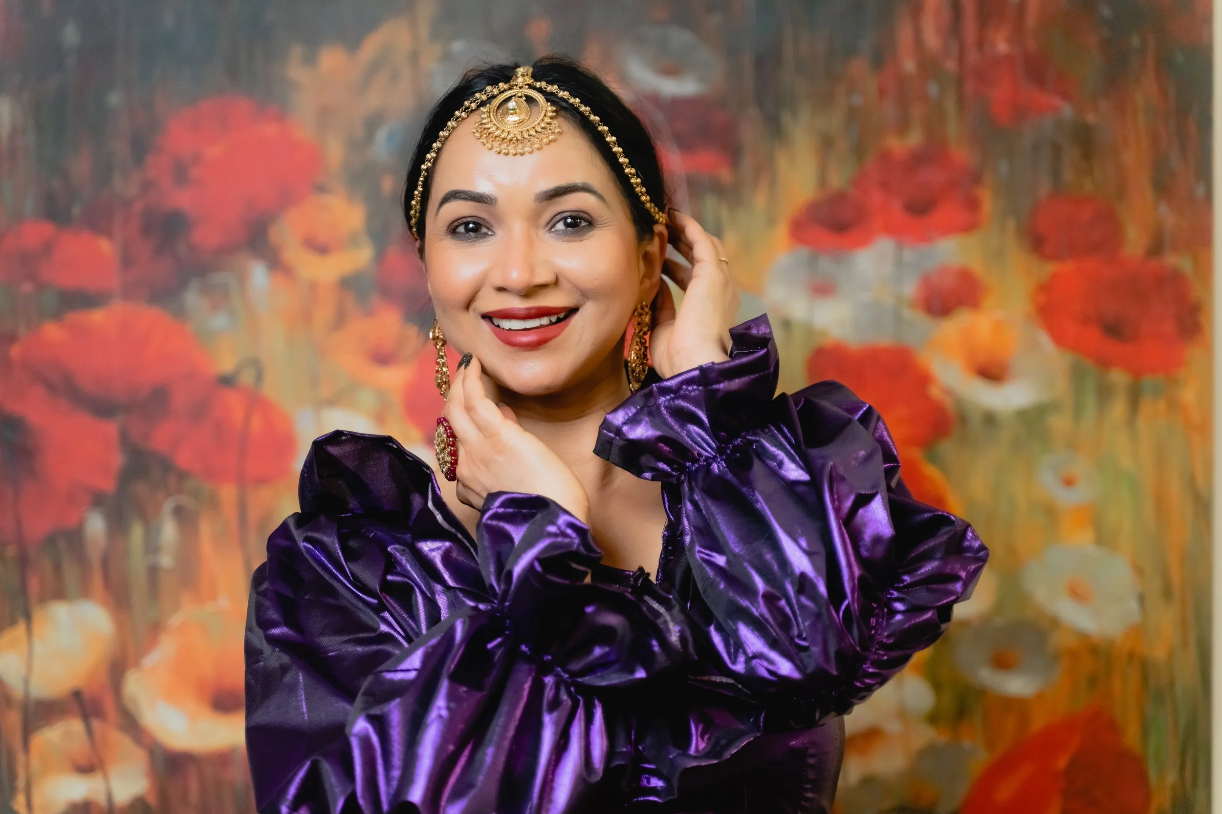 Woman wearing a purple satin top with ruffled sleeves, gold jewelry, and a headpiece, smiling in front of a colorful floral background.
