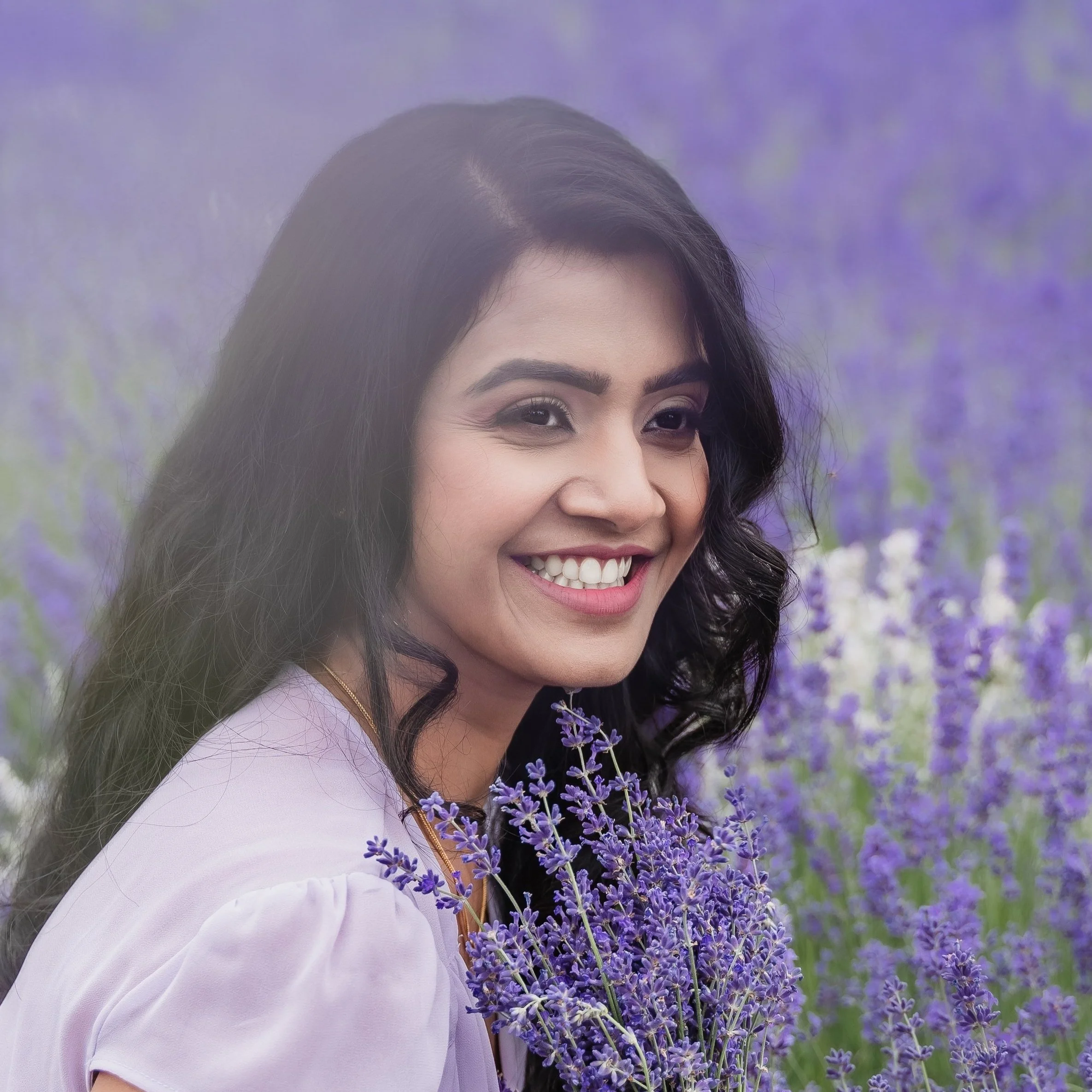 A woman smiling in a lavender field holding a bunch of lavender flowers.