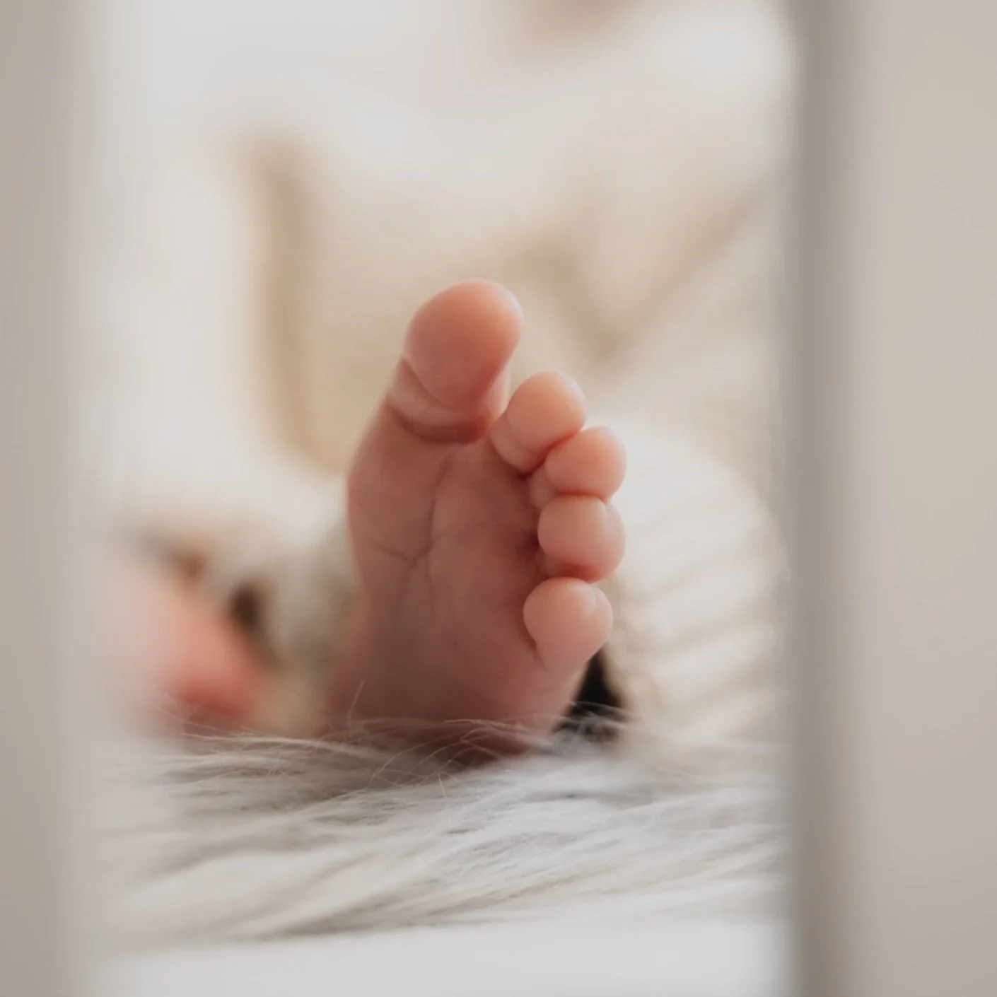 Close-up of a baby's hand with curled fingers, lying on a soft, furry surface with a blurred background.
